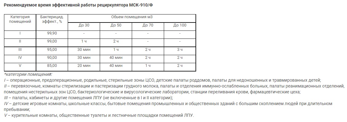 Рециркулятор МЕГИДЕЗ 910Ф оснащен фильтром и одной бактерицидной УФ-лампой 30 Вт, 10800 часов наработки. Подходит для размещения в доме, квартире, офисе, в торговых помещениях и в помещениях медицинского назначения до 50 м³, кроме операционных и стерильных зон. В периоды эпидемий и при большом скоплении людей, рекомендуем включать прибор на 3 часа и более.