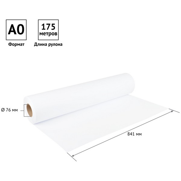 Размер бумажного полотна составляет 841 мм, что соответствует формату А0. Длина рулона - 175 м. Внутренний диаметр втулки - 76 мм.