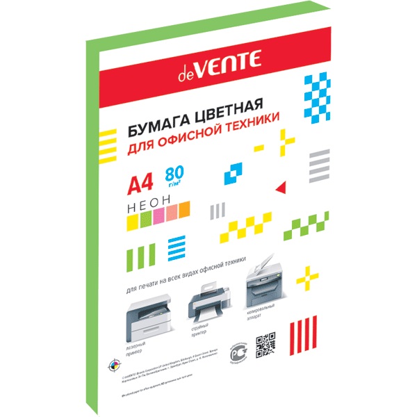 Бумага цветная для офисной техники "deVENTE" A4 100 л, 80 г/м², неон зеленый, картонная подложка, в термоусадочной пленке
