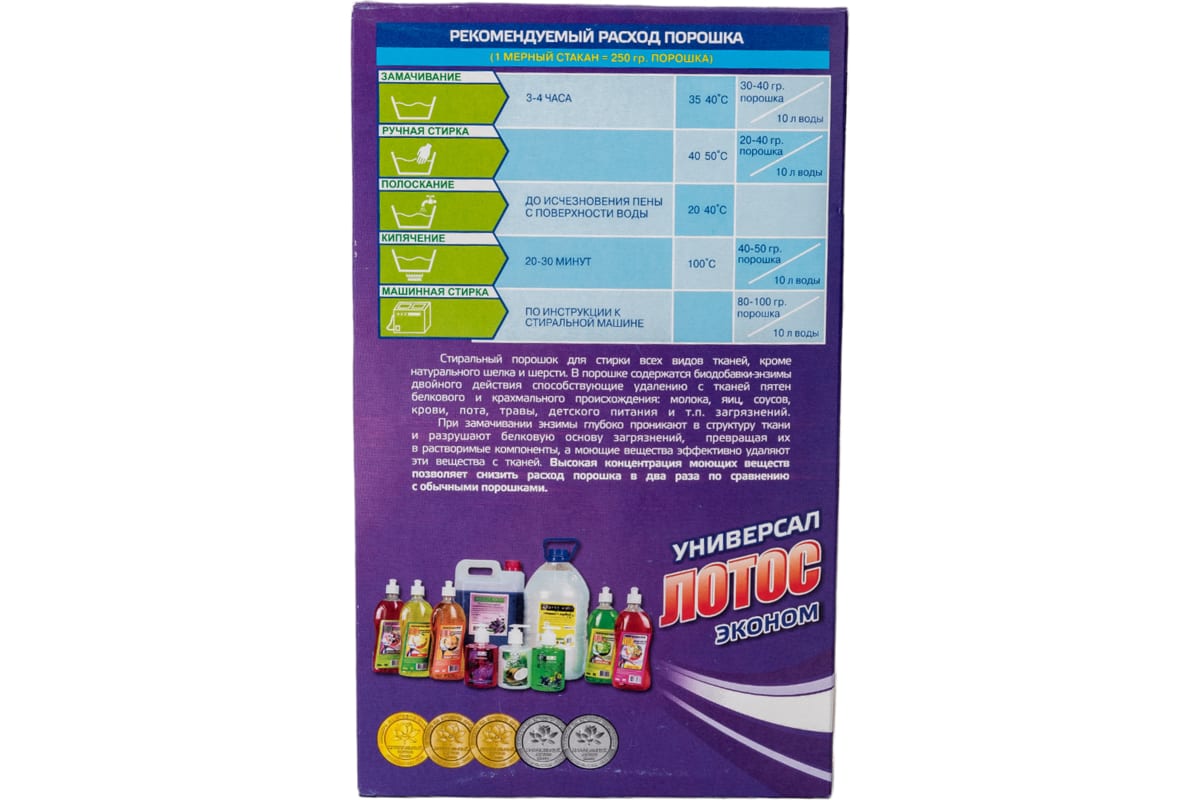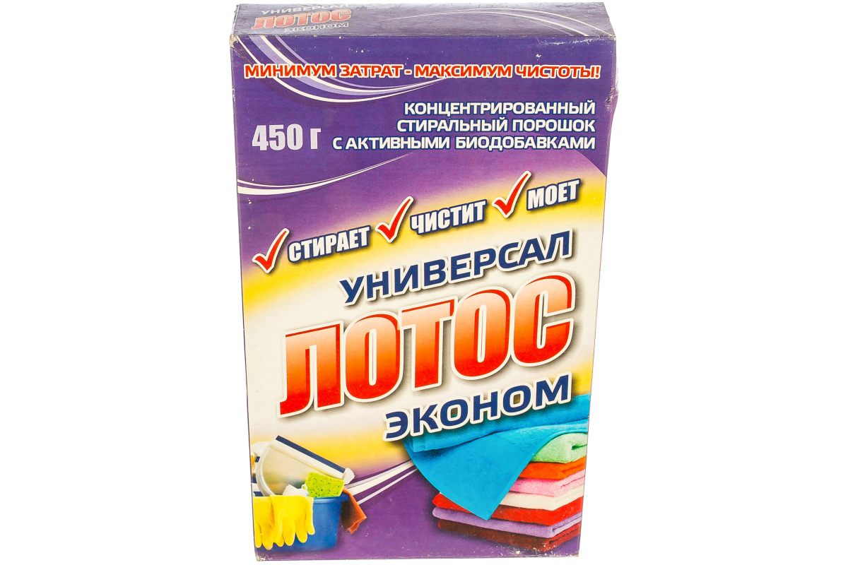 Cостав и характеристики концентрированного стирального порошка ЛОТОС Универсал обеспечивает его эффективность в качестве чистящего, моющего и стирального средства. Подходит для цветных вещей. Используется для уборки помещений, чистки поверхностей. Оставляет после себя аромат свежести. Выпускаемый в картонных коробках в расфасовке по 450 г универсальный стиральный порошок ЛОТОС позволяет минимизировать затраты на покупку нескольких разнонаправленных средств. Содержит ПАВ, соединения натрия, отбеливатель, карбоксиметилцеллюлозу, отдушку.