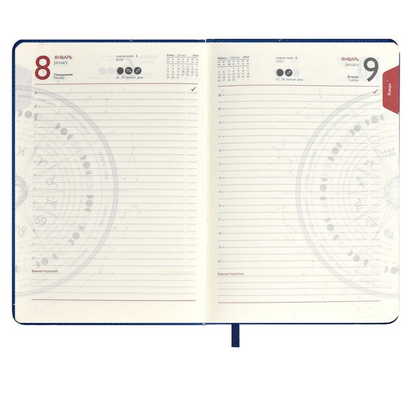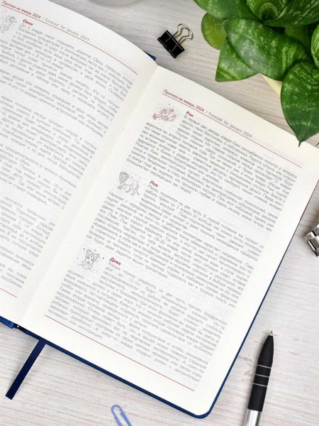 Ежедневник датированный А5, 200 л., кожзам: 146х211 мм, твёрдый переплёт с поролоном, материал обложки: искусственная кожа "Софт-тач металлик"; декор: тиснение фольгой; способ крепления блока: ниткошвейный; вн. блок: 200 л., кремовый офсет 70 г/м², печать в две краски (линия), справочный материал: есть; перфорация углов блока: нет; закладка/-и: одно ляссе; каптал: есть; форзац: печать в одну краску; особенности: в блоке прописаны астрологические прогнозы на год и на каждый месяц для всех знаков зодиака от одного из самых известных астрологов в России – Василисы Володиной; персонализация возможна: нет; индивидуальная упаковка: промостикер + ПЭТ-пакет