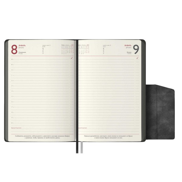 Ежедневник датированный , А5, 176 л., кожзам: 146x211 мм, твёрдый переплёт, материал обложки: искусственная кожа "Честер"; декор: блинтовое тиснение; способ крепления блока: ниткошвейный; вн. блок: 176 л., кремовый офсет 70 г/м², печать в две краски (линия), справочный материал: есть; перфорация углов блока: нет; отделка среза: окрашивание пантоном; закладка/-и: два ляссе; каптал: есть; форзац: печать пантоном; особенности: магнитный клапан, в блоке использованы мотивирующие высказывания одного из известнейших бизнес-консультантов мира, ведущего специалиста в области эффективного управления бизнес-процессами, преподавателя, автора 29 книг – доктора Ицхака Калдерона Адизеса; персонализация возможна: да; индивидуальная упаковка: промостикер + ПЭТ-пакет