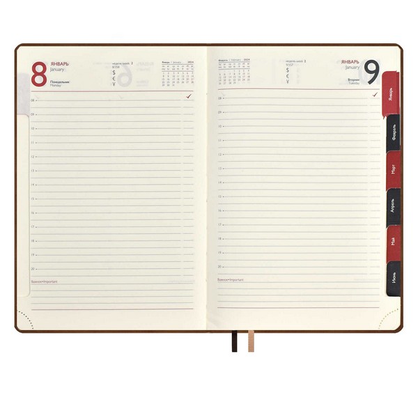 Ежедневник датированный А5, 176 л., кожзам: 146x211 мм, твёрдый переплёт, запаянный край, материал обложки: искусственная кожа "Винченцо"; декор: блинтовое тиснение; способ крепления блока: ниткошвейный; вн. блок: 176 л., кремовый офсет 70 г/м², печать в две краски (линия), справочный материал: есть; перфорация углов блока: есть; закладка/-и: два ляссе; каптал: есть; форзац: печать пантоном; особенности: вырубка блока по месяцам; персонализация возможна: да; индивидуальная упаковка: ПЭТ-пакет
