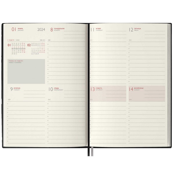 Еженедельник датированный 2024 , А5, 80 л. ПВХ 134х189 мм, мягкий переплёт, съёмная обложка, материал обложки: ПВХ; декор: тиснение фольгой, металлический шильд по краю обложки, способ крепления блока: вставной блок, ниткошвейный; вн. блок: 80 л., кремовый офсет 70 г/м², печать в две краски (линия), справочный материал: есть; перфорация углов блока: нет; закладка/-и: два ляссе; каптал: нет; форзац: печать пантоном; особенности: карман(-ы) на лицевой части обложки, клапан-закладка, планирование на 13 месяцев; персонализация возможна: нет; индивидуальная упаковка: ПЭТ-пакет
