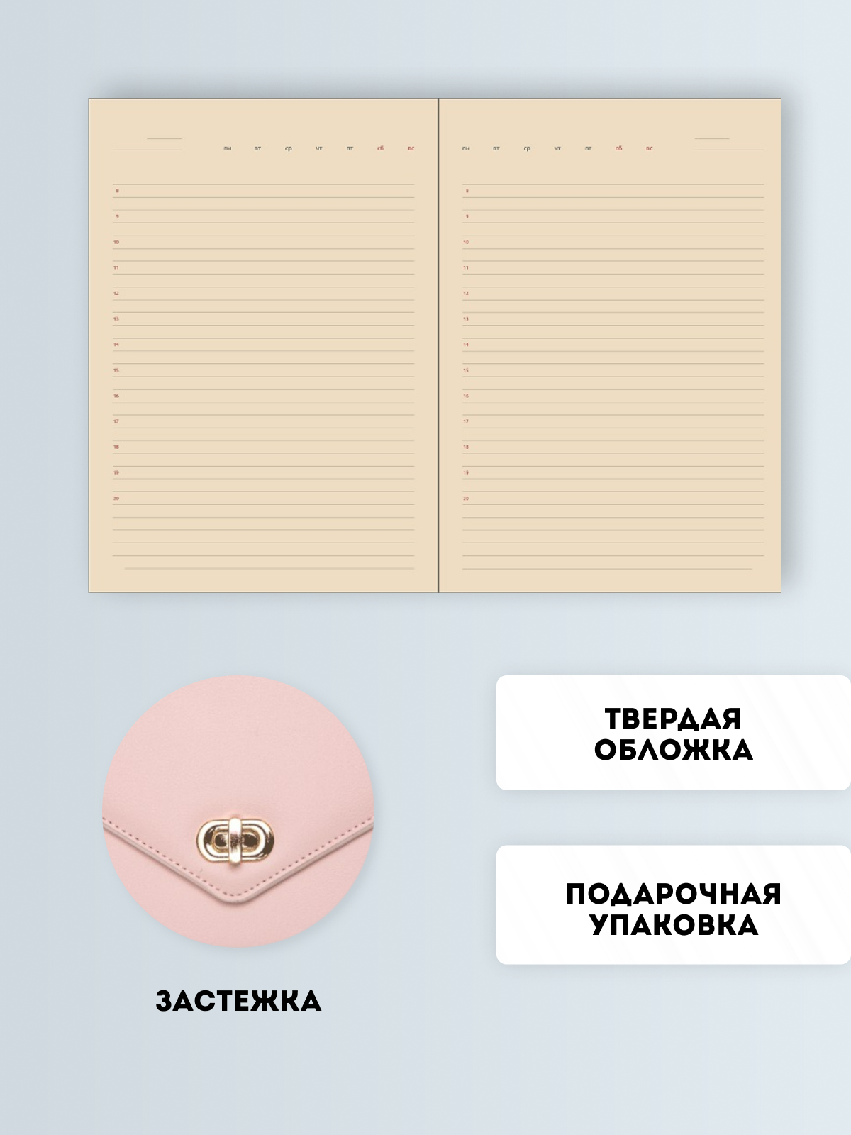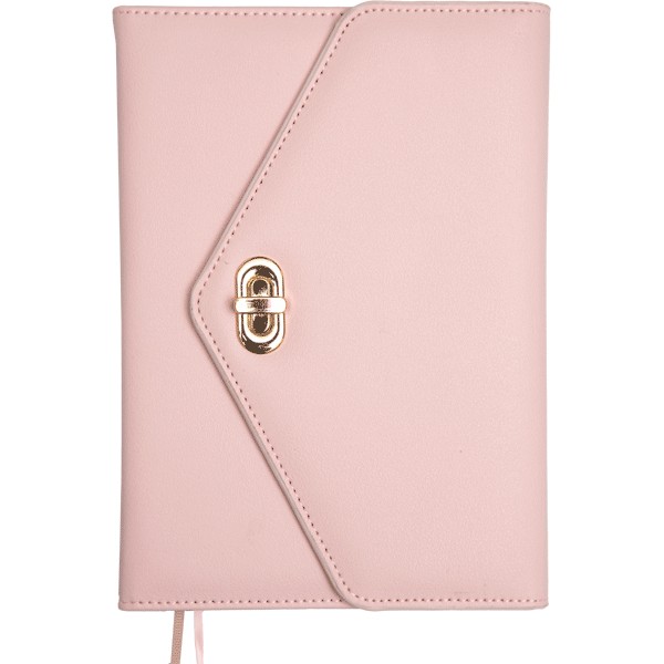 Ежедневник недатированный A5 (145 ммx205 мм) 320 стр, кремовая бумага 70 г/м², печать в 2 краски, твердая обложка из искусственной кожи с поролоном, створка на металлической застежке, отстрочка, перфорация, 2 ляссе, в подарочной коробке, нежно-розовый