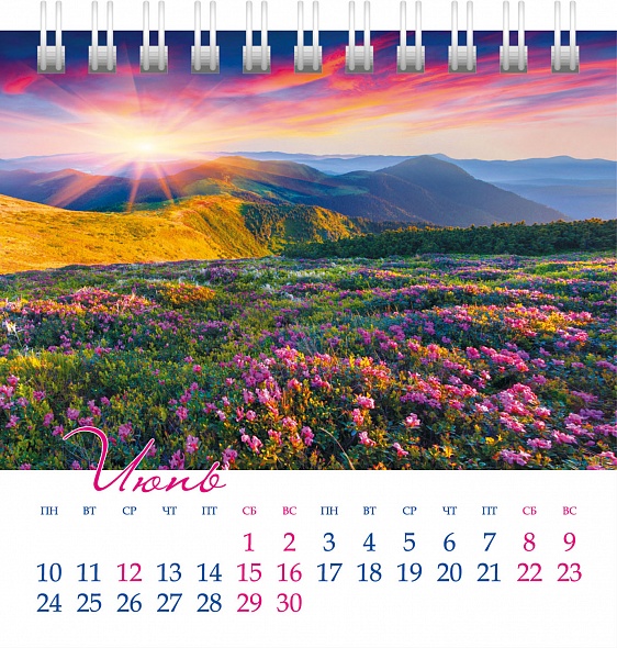 Настольный перекидной календарь на гребне. Формат: 101х101 мм, количество листов: 12. Обложка и блок: цветные, мелованная бумага 115 гр. Подставка: жесткий картон 250 гр. Основным преимуществом календаря является компактный и эргономичный размер. Каждая страница содержит привлекательное и красочное изображение с удобной календарной сеткой.