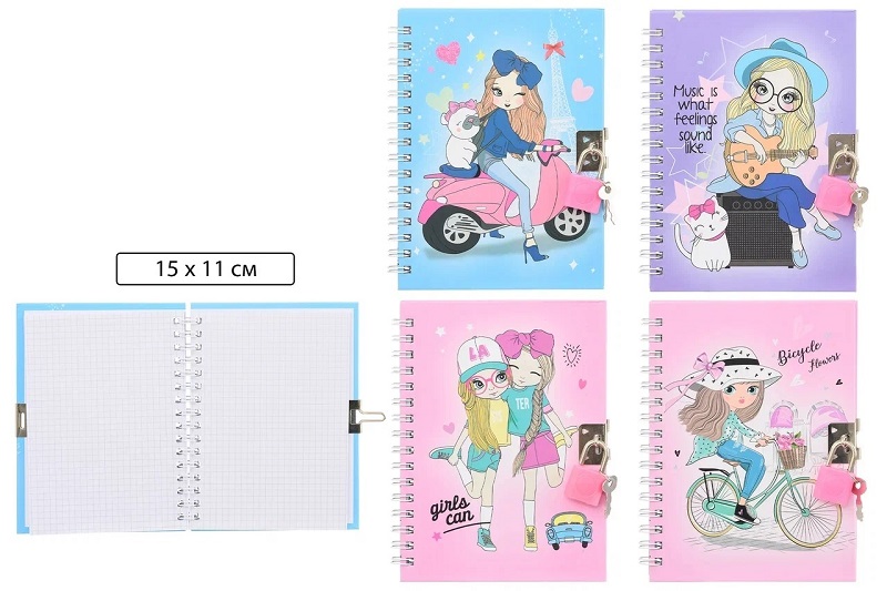 Блокнот детский+замочек: яркая, цветная 7БЦ обложка с рисунком /ассорти/, блок-клетка, на гребне, 48 л.; 15*11 см.