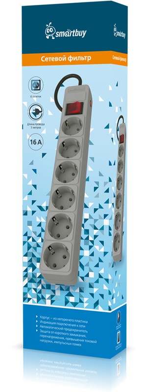 Сетевой фильтр 16А, 3500 Вт, 6 гнезд, без з/ш, с з/к, серый SBSP-6-50-G