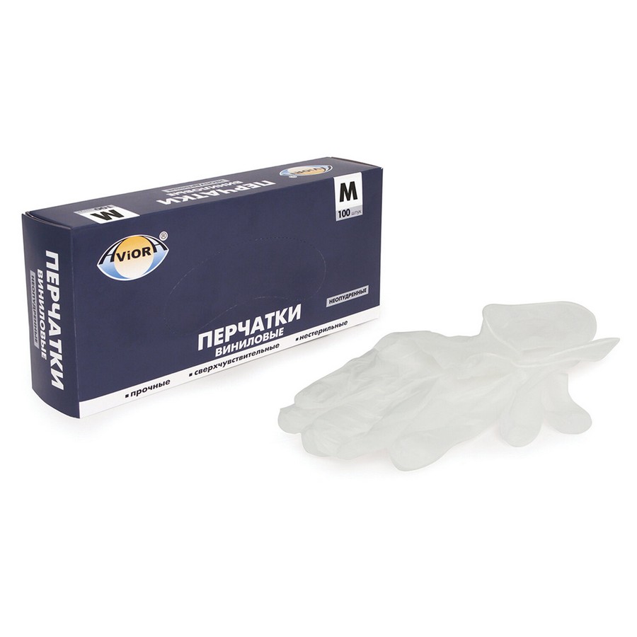 Перчатки виниловые белые, неопудренные, прочные, разм. M, 50 пар (100шт.), картонная коробка