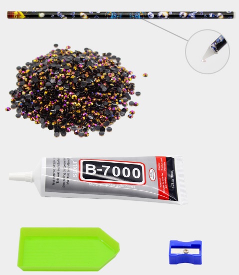 В комплекте фигурка медведя, стразы, лоток для страз, карандаш для выкладки страз, и клей для алмазной мозаики.